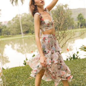 Our Cream Leaf Print Set is made for the girl who loves to stand out. The high-rise crop top includes self-tie shoulder straps and a back button closure, while the skirt offers a high-waist with self ties. It's all finished...